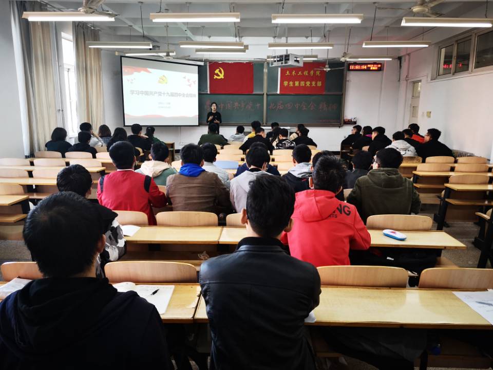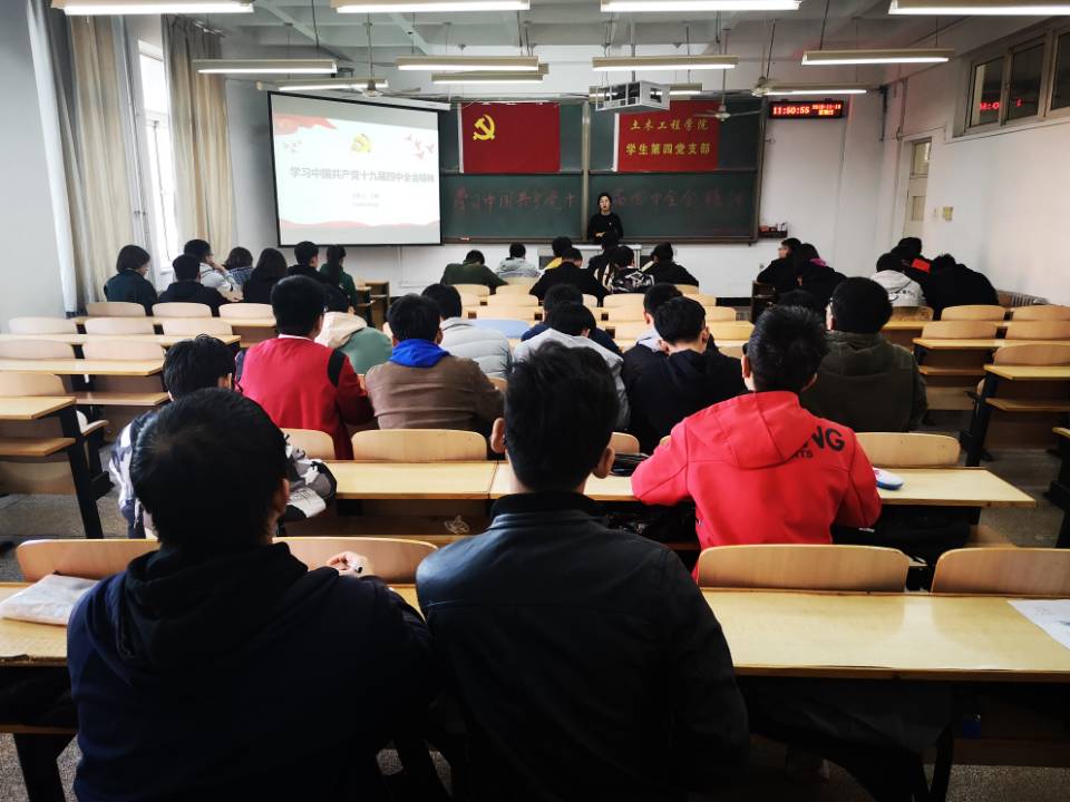 2019年11月10日上午11:50土木工程学院学生第四党支部在文馨书院B108开展了主题为“学习中国共产党十九届四中全会精神”的党课。支部书记王艳老师为全体党员和部分积极分子讲解了本次党课。