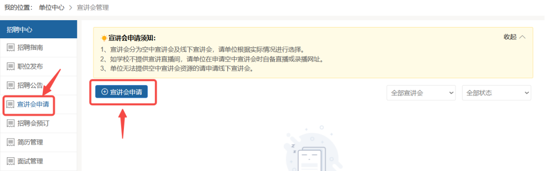 点击【空中宣讲】,填申请信息、职位需求后提交至学校管理员审核,审核通过后开展空中宣讲会。