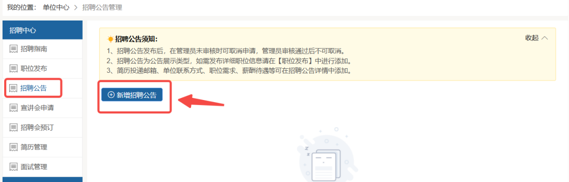 在【单位中心】找到目标学校,点击【一键登录】跳转至学校就业网。点击【招聘公告】—【新增招聘公告】,填写招聘信息(公告有效期默认为60天,最长可设置为90天)并提交审核,审核通过后将在学校就业网招聘公告栏目显示。