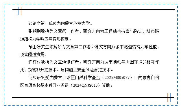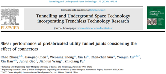 近日,我院隧道智慧建养与深地储能技术团队张朝副教授在Tunnelling and Underground Space Technology期刊(JCR一区,中科院一区TOP,IF=7.4)发表题为“Shear performance of prefabricated utility tunnel joints considering the effect of connectors”(DOI: https://doi.org/10.1016/j.tust.2026.107538)的研究成果。