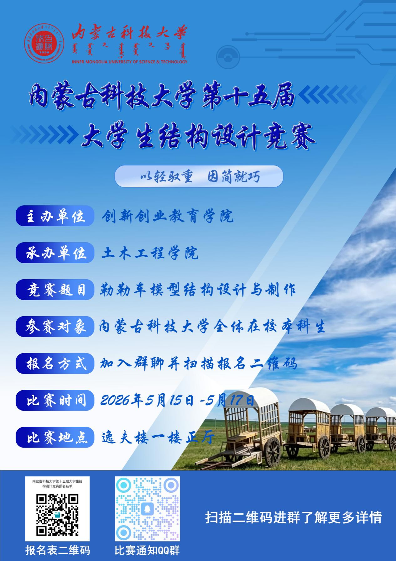 为激发大学生对结构设计的热爱,提升大学生的实践能力,培养创新精神、团队协同能力,实现“以赛促学、以赛促教、以赛促研、以赛促建、以赛促改、以赛促用、以赛促效”,提升实践教育教学和创新人才培养质量,同时也为更高一级竞赛选拔人才,现举办内蒙古科技大学第十五届大学生结构设计大赛。