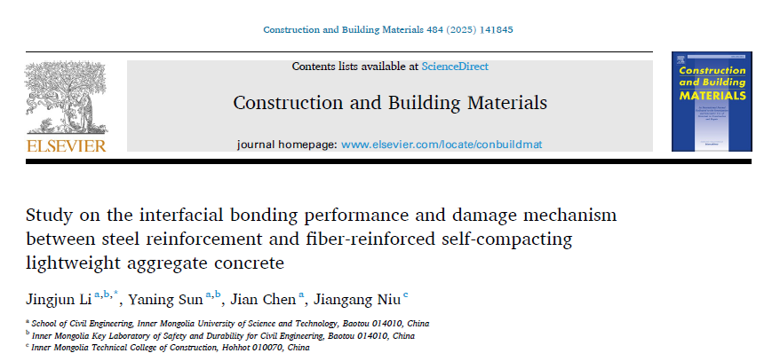 近日,内蒙古科技大学土木工程学院工业与城市固体废弃物建材资源化利用团队李京军教授在Construction and Building Materials期刊(IF=8.0,中科院1区TOP)发表题为“Study on the interfacial bonding performance and damage mechanism between steel reinforcement and fiber-reinforced self-compacting lightweight aggregate concrete”(DOI: 10.1016/j.conbuildmat.2025.141845)的研究成果。该研究系统探究了纤维增强自密实轻骨料混凝土与钢筋的界面粘结性能与损伤机理,通过11组中心拔出试验分析了强度等级、纤维掺量与钢筋直径对粘结滑移行为的影响,结合有限元模拟揭示了损伤机制,建立了极限粘结强度计算公式与粘结-滑移本构模型,并验证了纤维桥联效应对抑制裂缝扩展的关键作用。