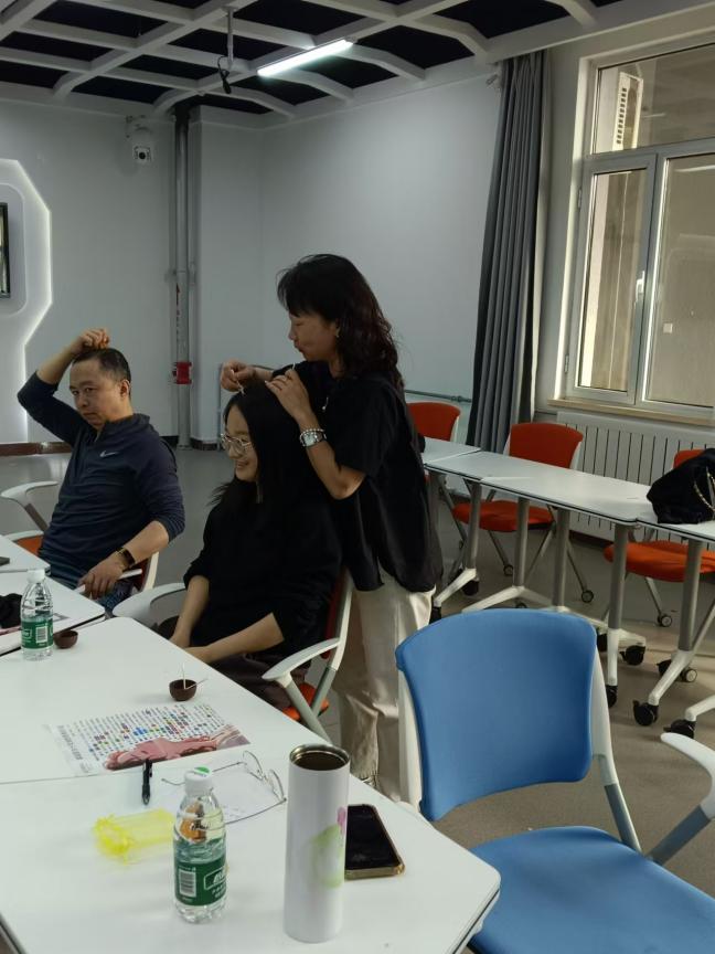 活动的重头戏是“芳香头疗”环节。主讲人首先讲解了头疗的健康益处、头部主要经络走向及操作要点。随后,老师们两人一组,在芬芳的精油气息中相互进行头部经络按摩。这一过程不仅促进了头部血液循环,更在彼此关爱的指尖传递中增进了情谊,现场洋溢着温暖与感动。