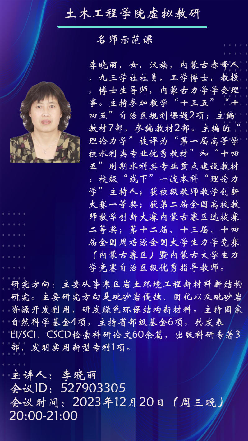 2023年12月20日晚,土木工程学院虚拟教研室“名师示范课”系列第二场活动顺利举行。李晓丽教授以“力学教学创新与科研反哺课堂的探索与实践”为主题,通过腾讯会议平台带来了一场内容丰富、见解独到的教学盛宴,吸引了全国多所高校教师与研究生的积极参与。