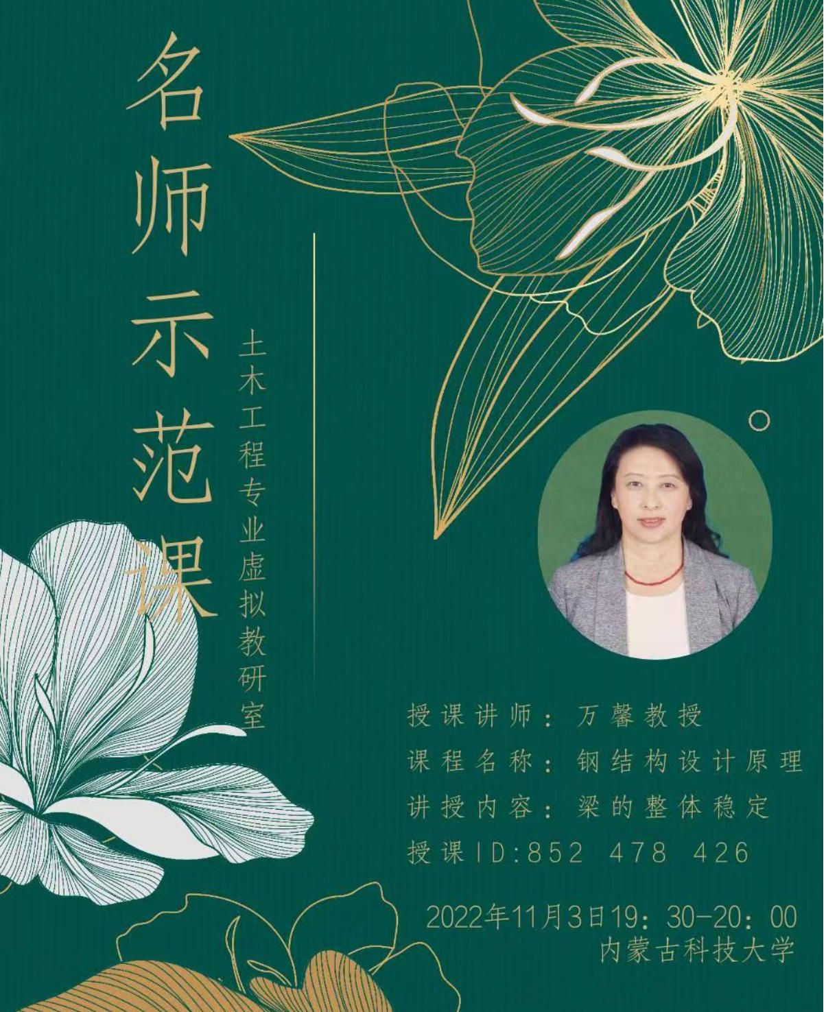 2022年11月3日晚,土木工程专业虚拟教研室名师示范课系列活动如期举行。内蒙古科技大学万馨教授以《钢结构设计原理》中的“梁的整体稳定”为核心内容,通过腾讯会议平台呈现了一堂深入浅出的专业课程教学示范,为全国土木工程专业师生展示了难点内容的教学突破与创新。